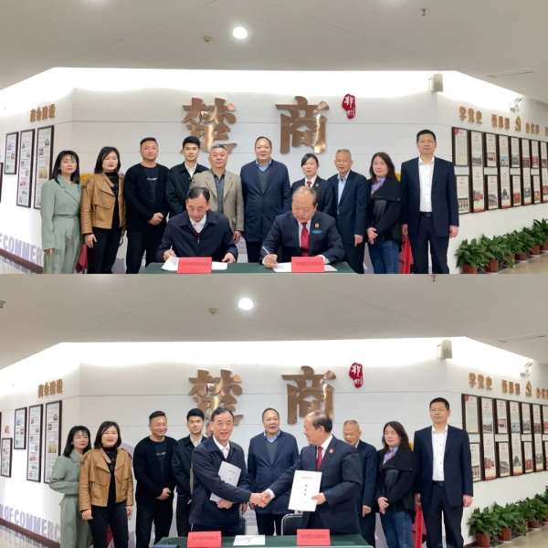 鄂城区人民法院院长周国旗与鄂州楚商联合会党总支副书记柯贤合签订合作协议。