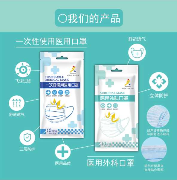 产品有包装规格多样的一次性使用医用口罩、医用外科口罩、KN95口罩、儿童口罩,有人性化的特色产品包括柔软舒适的护耳等,很方便的满足不同使用需求的人群。