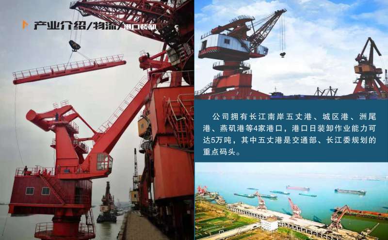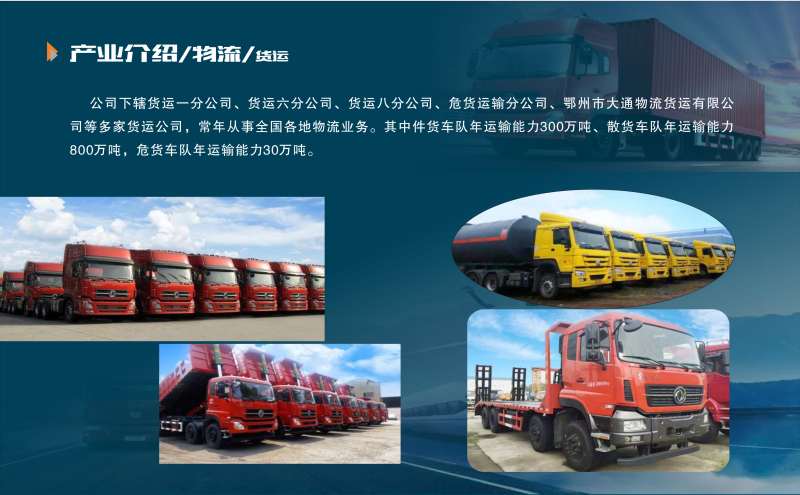 (1)公路运输:含件货、散货、沥青5家货运公司,主要包括48台电动重卡、60台柴油重卡及其他各类特种车辆20余台。(2)港口装卸:主要包括五丈港、城区港、黄柏山港三家港口单位,年吞吐量可达千万吨。(3)物流仓储:主要包括四处物流仓储基地,共计室内库3万平米、露天库30万平米。(4)网络货运:大通网络货运公司是鄂州市目前唯一一家取得国家资质的企业。(5)航运及其他:拥有自有船舶吨位5000吨、可对外提供汽修和汽车充电服务等。