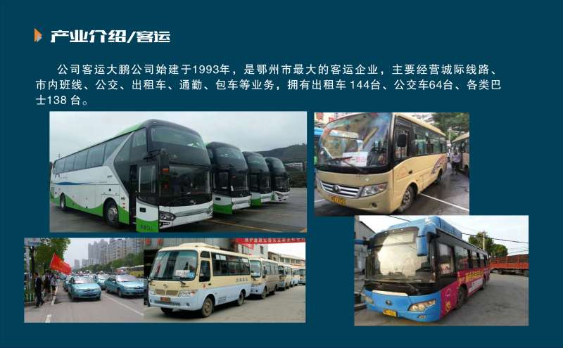 (1)客运:鄂州市大鹏客运公司(子公司)拥有各类公交、出租、班线、通勤车辆350台。(2)商业管理:大通鄂东水果大市场,经营户140余户;大通农贸市场,经营户220余户;大通物业公司,管理3个房改房小区及2.4万平米商业。(3)教育培训:包括鄂州市机动车驾驶员培训学校、鄂州市大通职业技能培训学校。(4)机械制造:湖北鄂重公司(子公司)从事机械制造、配件销售、仓储租赁、停车服务等业务。