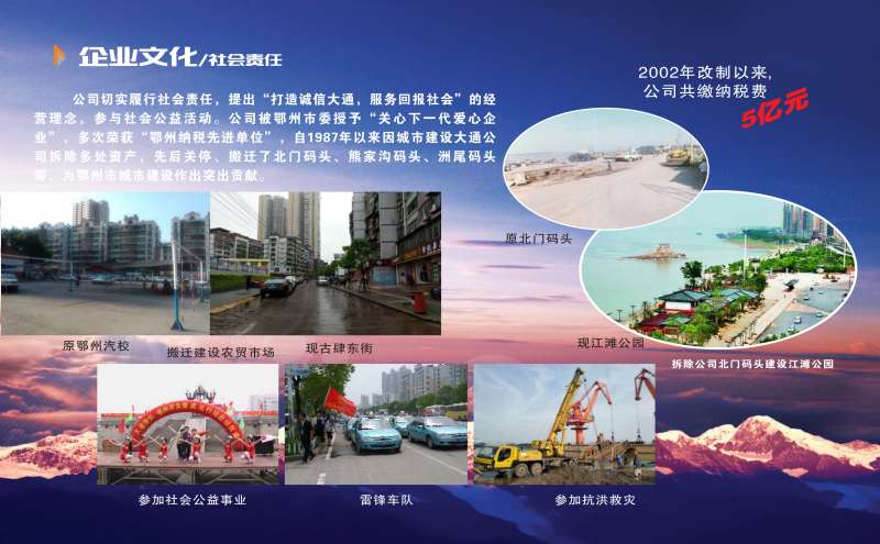 多年来,大通公司无条件服从、支持市委市政府决策,配合鄂州城市建设、环境保护,诚信经营、依法纳税,履行企业责任。码头关停,鄂州汽校搬迁,及时解决了市政府多年未解决问题,为鄂州城市建设和环境保护作出了贡献;发挥带头作用,支持鄂州市城市建设、“创卫创文”、“治超治限”工作;2020年疫情期间,组织68台货车、87台客车,支持疫情防控,承担武汉火神山医院运输及接送,集鄂州市80%医用物资集转调运,义务承担各类费用200余万元,被中国道路运输协会、中国物流与采购联合会、鄂州市委市政府授予抗疫先进集体;2021年公司上交税收近1500万元,近几年平均上交税收为1200万/年,最高年份超过3000万。近年来,公司先后被评为全国守合同重信用企业、湖北省守合同重信用企业、湖北省著名商标、湖北省服务业重点企业、湖北省服务业重点品牌、湖北省文明诚信示范企业。