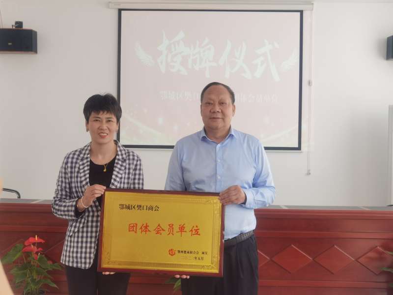 我会执行会长张新华向鄂城区樊口商会会长黄赛微授团体会员单位牌。