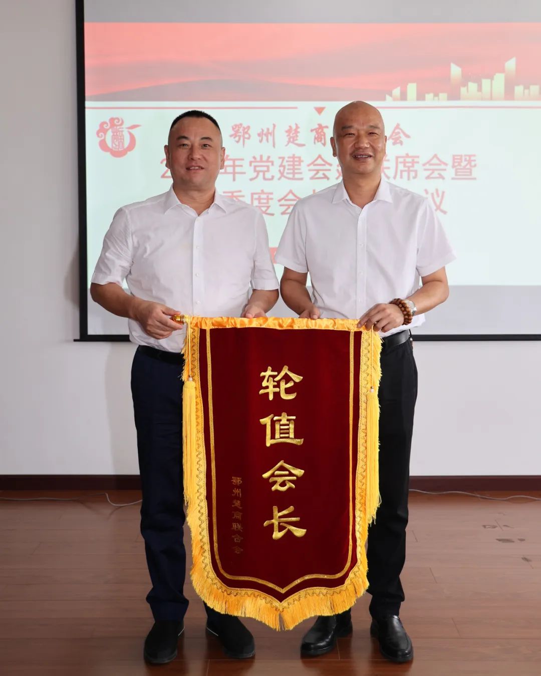 名誉会长叶佳斌为本年度第二任轮值会长湖北长城花园酒店股份有限公司董事长李惠强授旗;李惠强介绍了将在轮值期间运用湖北省餐饮行业协会资源,将楚菜与楚商结合,开展鄂州武昌鱼特色推广活动,通过餐饮文化交流形式,向全国展示鄂州餐饮魅力的思路。