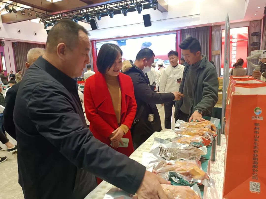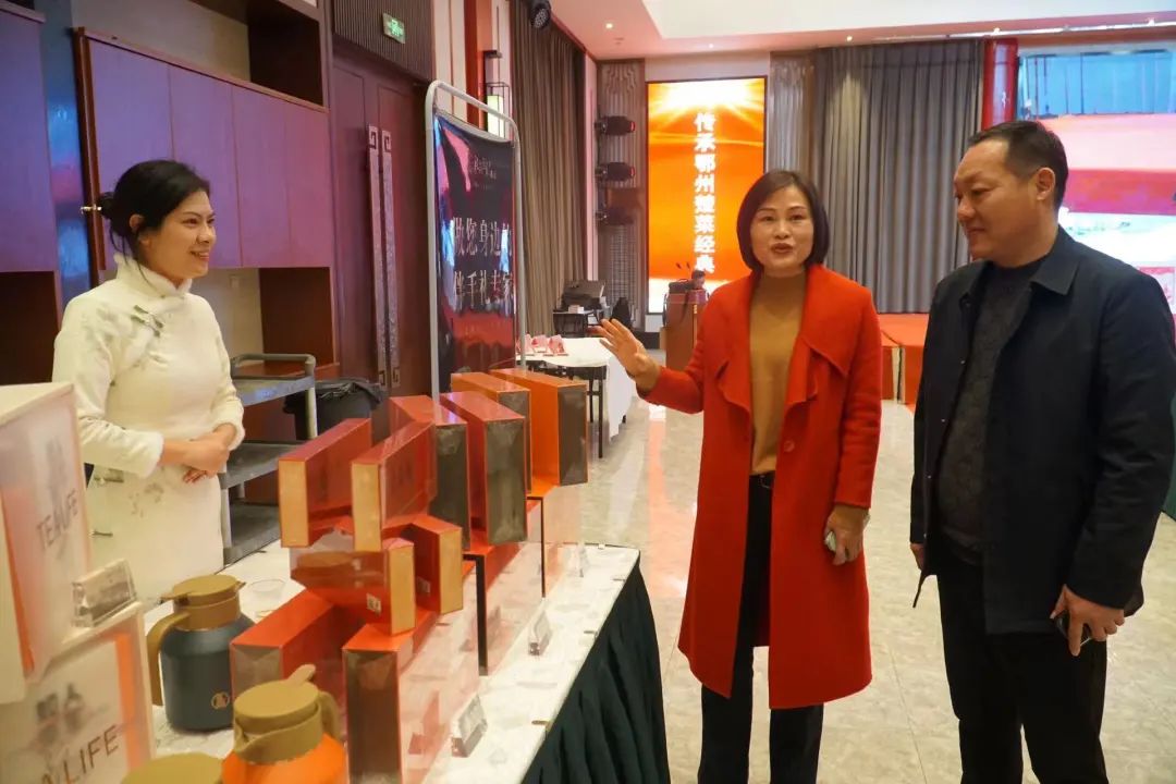 活动中,鄂州楚商8家会员企业现场展示特色产品,其中农业农村专委会4家展台浓缩了全市种养殖业的特色精品——鄂州市汀祖刘云村东明种养殖专业合作社为代表的纯手工制作豆丝、糍粑;鄂州市山禾生态农业旅游股份公司的央视展播产品白雉山鸡,中国黑宝雉山黑鸡、雉山黑鸡蛋;鄂州市洪力睿种养殖农民专业合作社的特色水果红颜草莓、美国糖桔、红美人;湖北碧绿农业有限公司的蓝莓系列、白芨护肤品系列、葡萄柚、辣椒酱等产品。另外4家展台分别为湖北金文峰酒业的白酒系列、鄂州市恒升达商贸有限公司代理的稻花香系列、鄂州礼尚往来茗饮有限公司的定制礼品系列、硒客(湖北)商贸有限公司的特色恩施土特产。各特色展台引来烹饪大师及餐饮企业负责人驻足而观并洽谈交流。