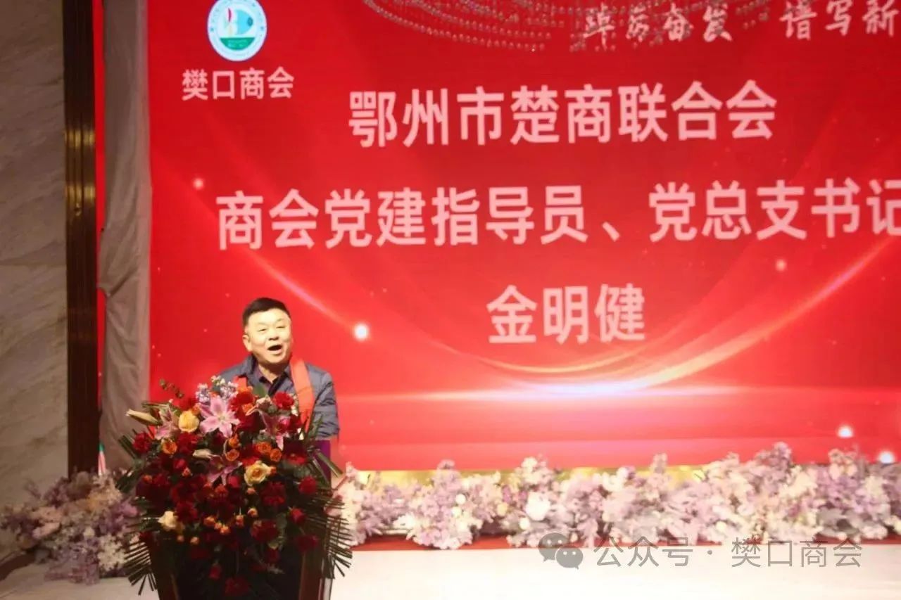 我会党建指导员、党总支书记金明健发表了热情洋溢的致辞。金明健表示,鄂州楚商联合会一直致力于服务会员、服务地方经济,为会员企业稳定健康发展营造了良好的内外环境,特别是搭建了“法律、金融、工会、就业创业”四大平台并取得了较好的工作成效。未来,商会还将拓展教育、医疗等领域,不断扩大为会员企业服务的领域范围,真诚希望两家商会在资源共享的基础上“优势互补”,共同为推动鄂州经济社会高质量发展贡献力量。祝愿樊口商会与鄂州楚商联合会携手并进,道路越走越宽,商会越办越好!