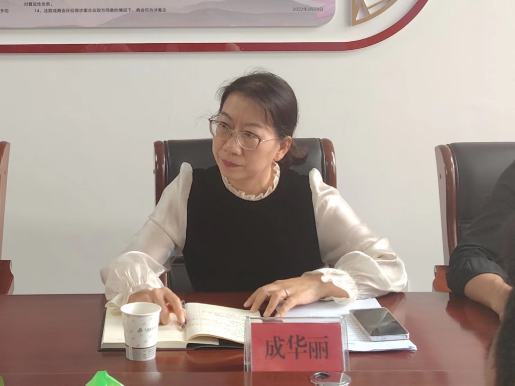 成华丽对商会充分发挥社会组织的功能作用,依托法律服务平台为会员企业排忧解难和保驾护航的工作做法、取得的成效给予了充分肯定,对调解数据统计、调解成功率和调解的方式方法等进行了具体指导,同时就商会人调工作存在的困难提出了建议和解决方法,并表示市司法局将全力支持商会人民调解工作。