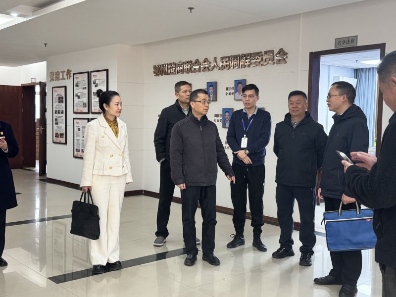 11月18日,湖北省高级人民法院立案庭庭长、二级高级法官熊顺,一级法官助理刘晓磊;鄂州市中级人民法院副院长兰飞;鄂城区人民法院副院长邓睿、立案庭庭长肖红彬一行莅临我会,实地调研指导楚商“共享法庭”运行及商事调解工作。